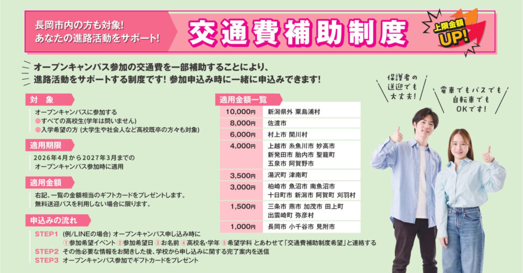 オープンキャンパス・平日個別相談会に参加する皆さんの交通費を補助し、進路活動をサポートします!