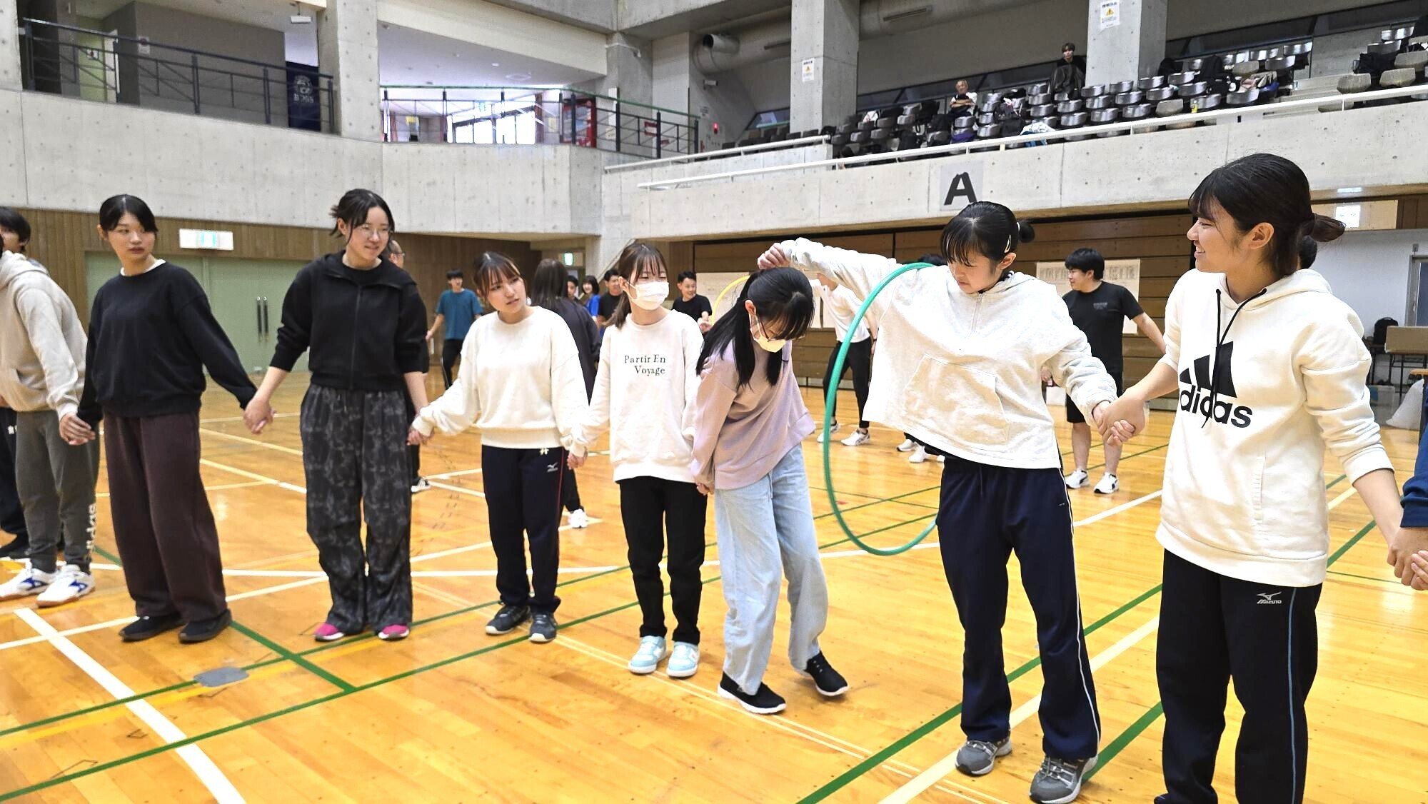 チーム全員で手を繋ぎ、その手を放さずフラフープに体を通して次の人に渡していき、先に最後の人まで渡した方が勝ち🤝🔥