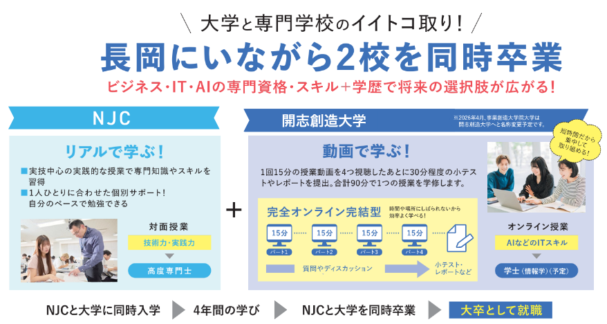 長岡にいながら大学と専門学校をW卒業し、大学の学びと専門スキルの両方を手に入れることができる制度!