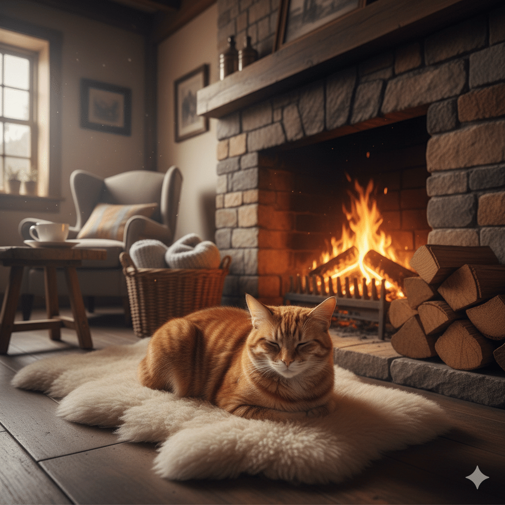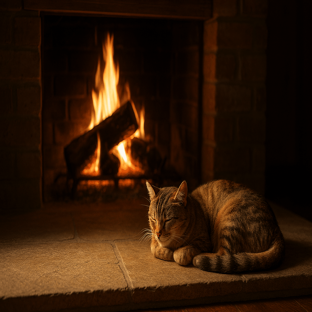 プロンプト:「暖炉の前で猫がまどろむ画像を作成して」
