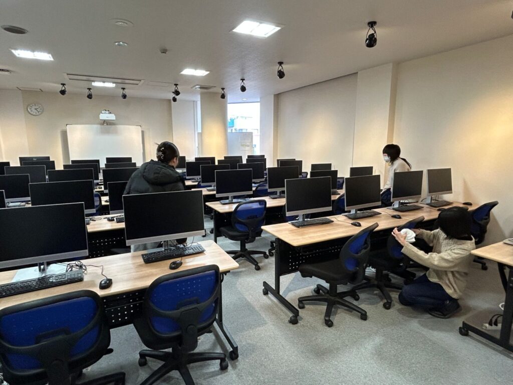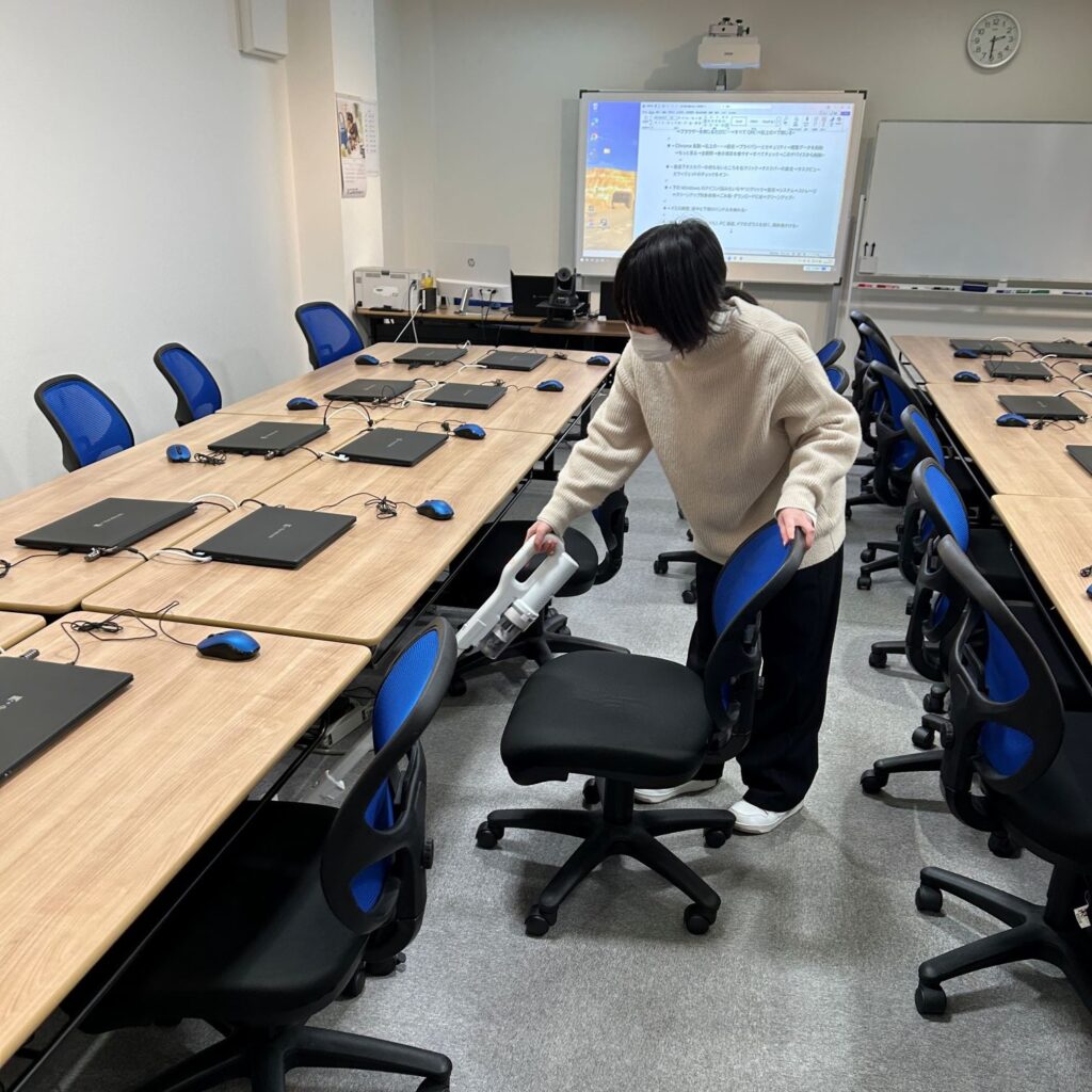 PC教室は、PCや机の下の配線に気をつけながら掃除をしていきます!