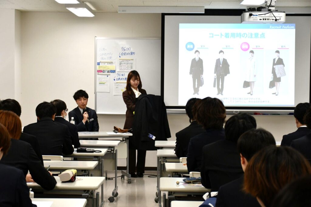 第1弾の就職研修では、「スーツ着こなし講座」と「センパイの内定体験談」を実施!